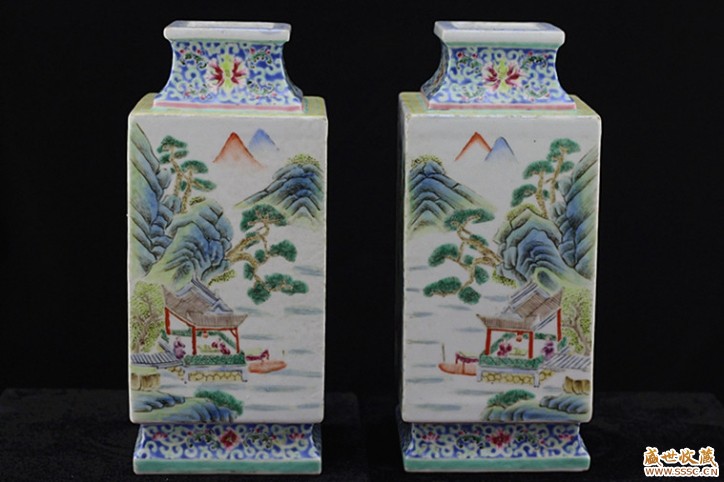 瓶身圖中遠(yuǎn)山疊翠,巨石巉巖,長河涓涓,或石拱小橋,或修竹幽庭,或漁舟客帆,或山徑旅人樵夫相問好,盡顯山澗旁居的自在閑適。兩只方尊八幅畫面,山水兩兩相對應(yīng),令人如游如居,目不暇接。整體色調(diào)艷麗而柔和,裝飾構(gòu)圖與設(shè)色渲染都極具匠心,山木遠(yuǎn)近錯落有致,石壁凹凸分明。胎體厚重,釉色潔白,釉面肥潤,白中閃青。底部有紅色纂書“大清道光年制”款。