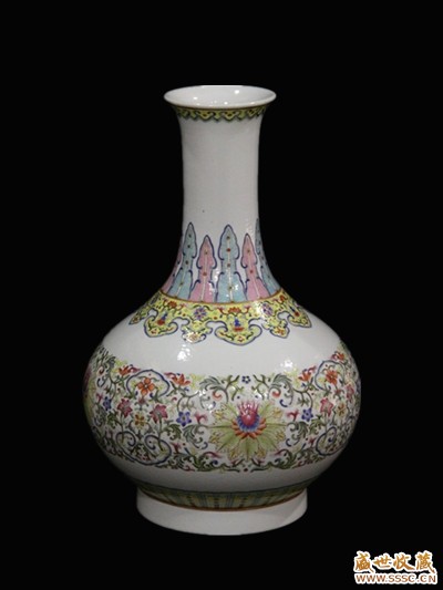 撇口,直頸,垂腹,圈足內(nèi)施白釉,以紅彩書“大清乾隆年制”纂書款。粉彩通體色調(diào)柔和而淡雅,畫工精致流暢,品相一流。