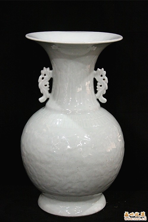 景德鎮(zhèn)窯燒造。盤口,粗頸,瑞獸雙耳,圓鼓腹,矮圈足,無款。瓶身暗刻花卉紋。