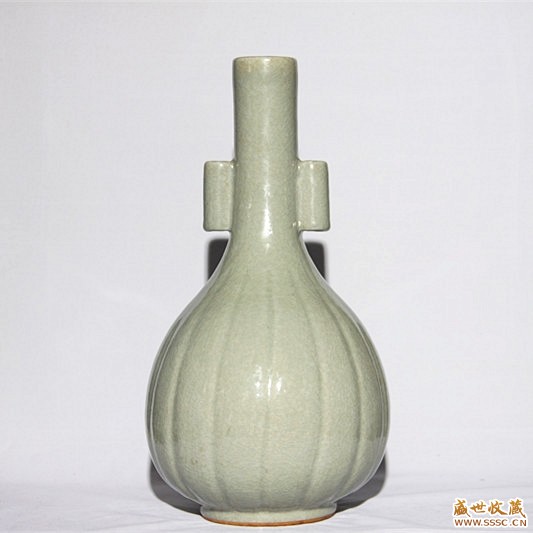 細(xì)長頸,圓鼓腹有16道瓜棱,矮圈足,臍內(nèi)青花纂書六字“大清乾隆年制款”。通體里外施釉色,胎質(zhì)細(xì)密,開片完美自然,官窯精品。
