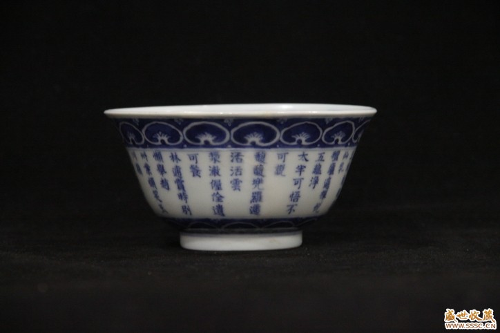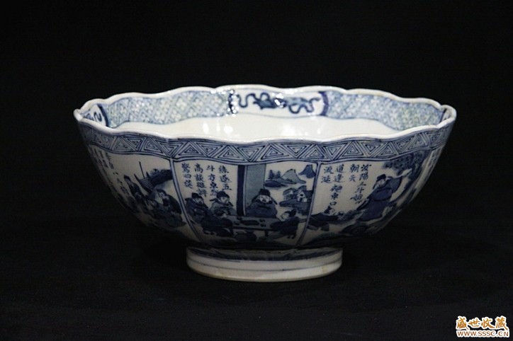 這首詩立意別出心裁,語言幽默,而制瓷工匠以高度的文學(xué)藝術(shù)素養(yǎng)將此簡練、白描的詩句以畫片的形式表現(xiàn)在碗上,繪有人物共27人,人物衣紋飄坲,表情豐富,舉手投足,恰到好處。整體保存完好,意趣盎然,十分難得。