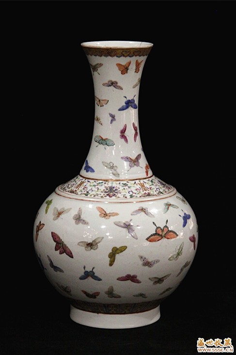 景德鎮(zhèn)窯燒造,微敞口,長頸,溜肩,圓腹,矮圈足,臍內(nèi)紅色楷書“大清光緒年制”款?谘靥幚L描金如意紋一周。肩部繪纏枝花卉配描金壽字紋一周。瓶身以極致工筆繪各色彩蝶數(shù)只。蝴蝶姿態(tài)各異,翩躚而動,仿佛讓人置身花叢,美不勝收。