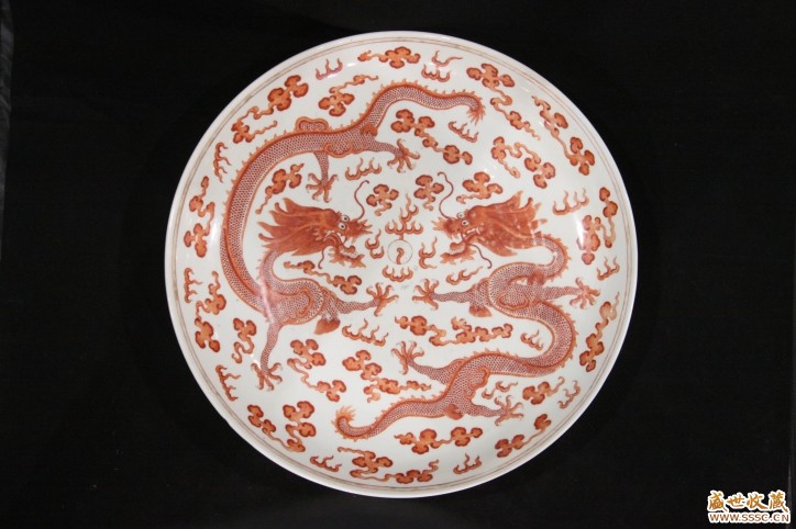 微撇口,淺弧壁,矮臥足。內(nèi)外以礬紅彩為飾?谘貎(nèi)畫雙圈一周,盤心繪珠,另圍無爪行龍二條,隙地加飾云朵,健龍逐珠嬉鬧,翻騰于云海之間,畫面頗為壯觀。盤外壁為二龍趕珠紋,上下各有礬紅單線,底足臍內(nèi)紅彩楷書“大清光緒年制款”。此盤畫工精致細(xì)膩,用筆流暢精道,品相完整,較為難得。