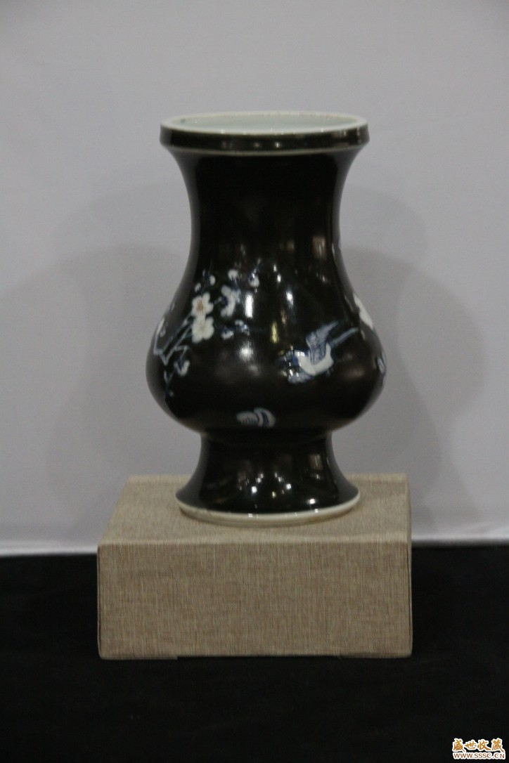 圈口,收頸,圓腹下垂,圈足外撇。腹身以白彩繪制巖石、梅枝、鳥雀,白彩上加以刀刻紋修飾,青花描出輪轂,其后尊身通體施烏金釉為地,另有白梅花心處以紅彩點染,最上層施釉。繪彩工藝獨特,造型規(guī)整莊重,尤為難得。
