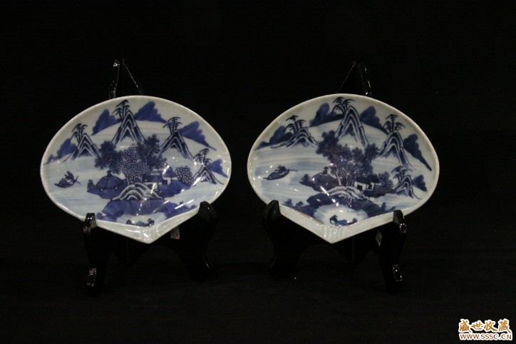 整體呈扇形貝殼狀,水洗里面繪制青花山水紋,背面成波浪紋棱,施以豆青釉,另作三底足。造型少見,品相完美。