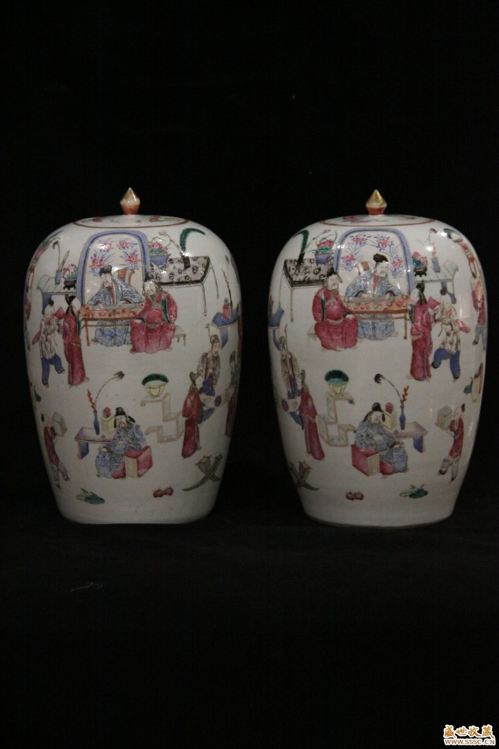 圓肩,腹部下收,平蓋,蓋紐描金。矮圈足,臍內(nèi)無款。罐身里外施白釉,上繪多組人物畫片。畫風(fēng)細(xì)膩生動,衣飾褶皺處理精細(xì),表情動作盡顯方寸之間。彩料艷麗卻又用色和諧。蓋面繪多寶。兩只一對,品相完美。