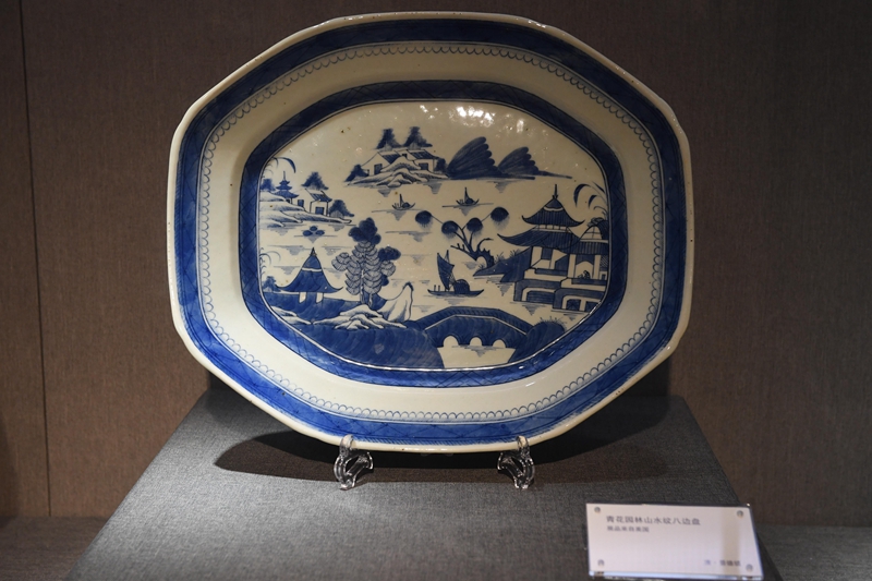 這是展出的從美國(guó)“歸來(lái)”的青花園林山水紋八邊盤(pán)