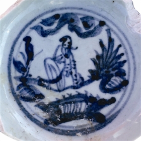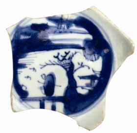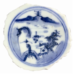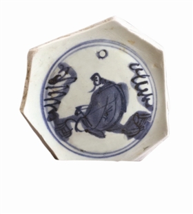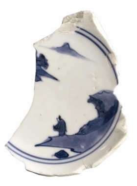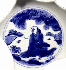 本文要介紹的這組明清時期青花瓷片上畫的都是“高士”。當(dāng)時的工匠把筆下線條表現(xiàn)在瓷上,幽谷之中,坐聽松風(fēng)泉鳴,全畫空寥寂靜。這讓我想到張大千的“高士圖”,那是他西康之游后的作品。與這些瓷畫相近的,都是高士思想與所游真景簡筆結(jié)合,或獨行獨坐,或絕塵孤思,幽然孤嘯,大有欲往從之游,愿言成獨往的幽靜境界。