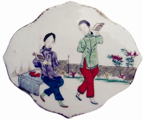 圖2是一件民國粉彩孩童讀書圖橢圓形瓷板。只見春風(fēng)和暢,綠草茵茵,鮮花爛漫,春意盎然,正是讀書大好時光。兩孩童一邊踏青,一邊讀書,令人感動。右邊孩童紅衣綠褲,雙手把書貼在胸前,正張口背誦詩句;左邊孩童藍衣黃褲,一手托書,側(cè)目望著紅衣孩童,似乎在聽其背誦。該瓷板玲瓏別致,施彩雅致,描繪生動,人物栩栩如生。