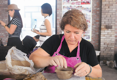 外國(guó)陶藝家在淄博制作陶藝作品。