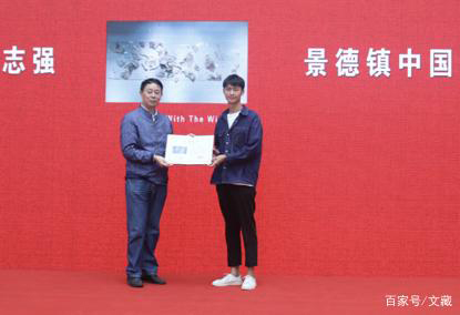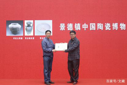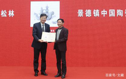 (景德鎮(zhèn)市文廣新旅局黨組成員、景德鎮(zhèn)中國陶瓷博物館館長趙綱為劉松林先生頒發(fā)證書)