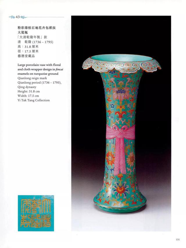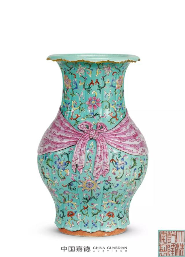 中國(guó)國(guó)家博物館所藏一件清乾隆綠地粉彩包袱尊為撇口式, 其周身紋飾布局與本品略似,若仔細(xì)觀察之下,不難發(fā)現(xiàn),本品將國(guó)博所藏包袱尊口部所飾平面如意云頭紋化裁為更為立體的外撇式如意形口,脛部亦制成與口沿相呼應(yīng)的如意式二層臺(tái),腹部設(shè)計(jì)為瓜棱形,使器物曲線變化更為靈動(dòng),更富韻律,這是本品除包袱裝飾之外另一大特點(diǎn)。