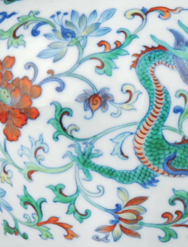本品龍鳳間滿飾各色花卉,花朵碩大飽滿,枝蔓舒展自如,呈現(xiàn)出“龍鳳呈祥” 之吉祥瑞意 。釉下青花與釉上彩料發(fā)色淡雅明麗,搭配和諧,裝飾性極強(qiáng), 可謂極盡斗彩工藝之能事。查閱公私收藏,尚未見(jiàn)有與本品器型和紋飾完全相同的作品,由此可見(jiàn),本品是為嘉慶御窯中頗為罕見(jiàn)的斗彩新創(chuàng)之作。