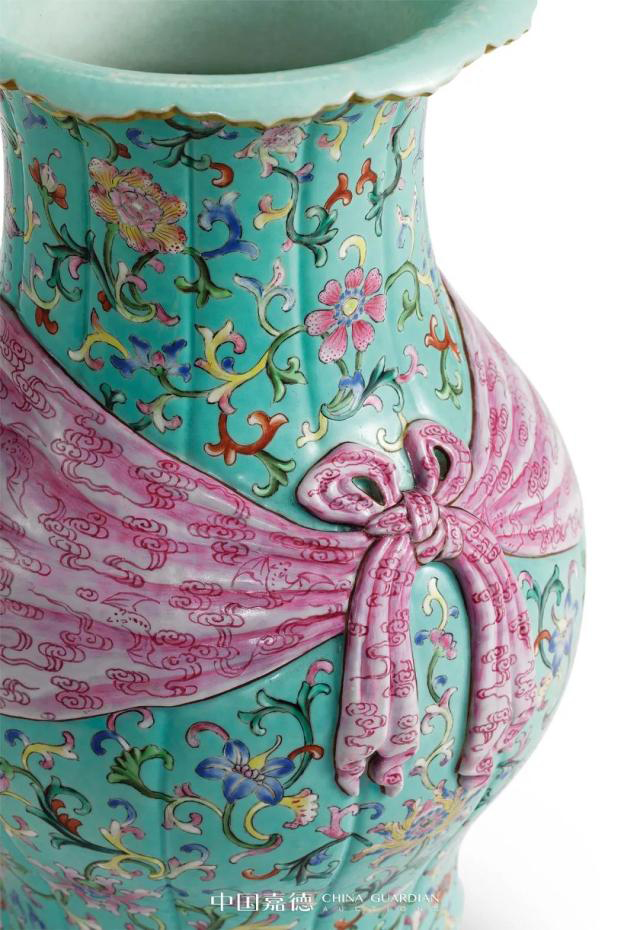 據(jù)傳世資料可知,色地洋彩纏枝花卉紋包袱尊新創(chuàng)于乾隆時(shí)期, 存世極罕,所見(jiàn)皆為乾隆御窯中鬼斧神工之作。其包袱的裝飾,有繪畫(huà)而成,有堆塑而成。其中堆塑之法更具立體感,但工藝也更為復(fù)雜,成本更高,本品即是此類(lèi)。