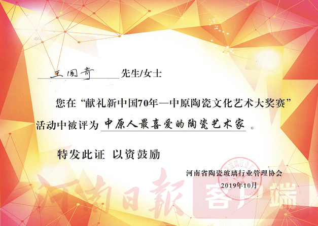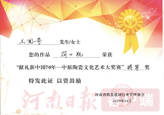 河南眾多陶瓷藝人中,款款走來了又一位大家。近日,在鄭州國際會(huì)展中心舉辦的“獻(xiàn)禮新中國70年·中原陶瓷文化藝術(shù)大獎(jiǎng)賽”上,汝窯復(fù)燒第一人王國奇再獲新榮譽(yù),被評(píng)選為“中原人最喜愛的陶瓷藝術(shù)家”。