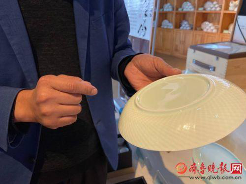 “這個(gè)不用洗潔精,你看,用水一沖,盤子上的油污就被清潔掉了。”11月12日上午,在山東海瓷文化股份有限公司展館青玉館,公司副總經(jīng)理王金魯拿著一款生物海瓷制作的盤子演示道。