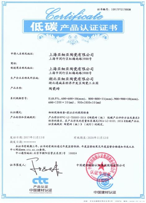 2012年,由財(cái)政部、住房和城鄉(xiāng)建設(shè)部下發(fā)的《關(guān)于加快推動(dòng)我國(guó)綠色建筑發(fā)展的實(shí)施意見》中提出,到2020年,綠色建筑占新建建筑的比重將會(huì)超過30%,以**限度節(jié)約資源,保護(hù)環(huán)境,為人民提供健康、適用、高效的使用**。亞細(xì)亞瓷磚,作為持續(xù)關(guān)注健康人居家裝的企業(yè),堅(jiān)持踐行環(huán)保重任,走企業(yè)可持續(xù)發(fā)展之路。一路走來,攬獲國(guó) 家 級(jí)綠色工廠證書、能源管理體系認(rèn)證、中國(guó)環(huán)保產(chǎn)品認(rèn)證證書、建材環(huán)保產(chǎn)品認(rèn)證證書、綠色建筑選用產(chǎn)品證書、綠色陶瓷磚等十多項(xiàng)綠色建材領(lǐng)域的專業(yè)權(quán)威認(rèn)證及榮譽(yù),走在中國(guó)陶瓷行業(yè)環(huán)保水平的最前列。