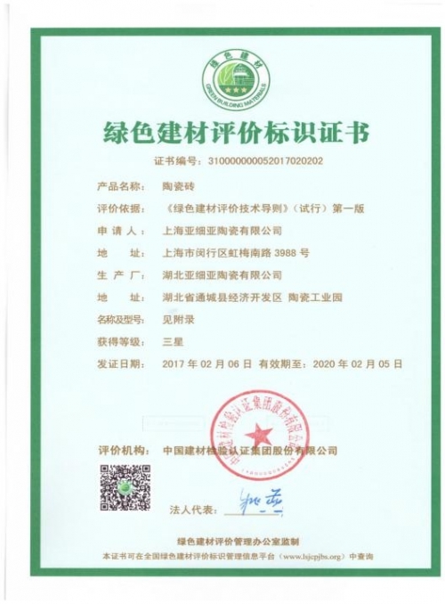三**綠色建材標(biāo)識(shí)為綠色建材的**等級(jí),素以審核條件嚴(yán)苛、環(huán)保排放要求高著稱,亞細(xì)亞瓷磚榮獲最 高 級(jí)別三**綠色建材評(píng)價(jià)標(biāo)識(shí),可見其在環(huán)保領(lǐng)域的投入與領(lǐng) 先。