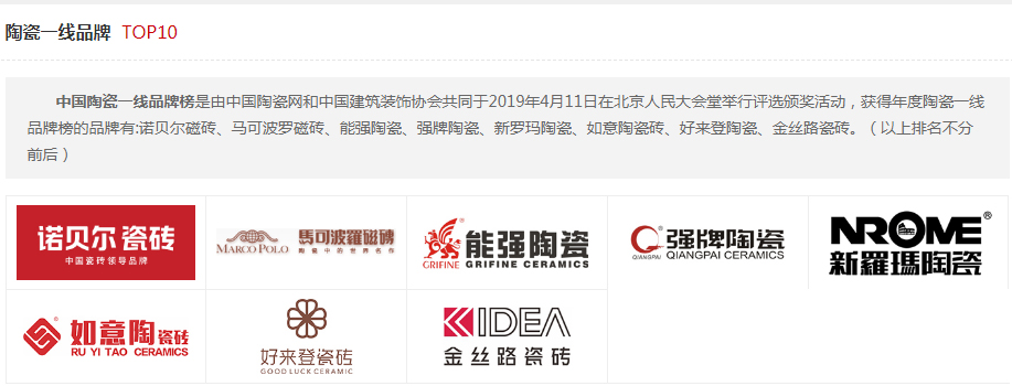 中國(guó)陶瓷一線品牌榜是由中國(guó)陶瓷網(wǎng)和中國(guó)建筑裝飾協(xié)會(huì)共同于2019年4月11日在北京人民大會(huì)堂舉行評(píng)選頒獎(jiǎng)活動(dòng),獲得年度陶瓷一線品牌榜的品牌有:諾貝爾磁磚、馬可波羅磁磚、能強(qiáng)陶瓷、強(qiáng)牌陶瓷、新羅瑪陶瓷、如意陶瓷磚、好來(lái)登陶瓷、金絲路瓷磚。(以上排名不分前后)