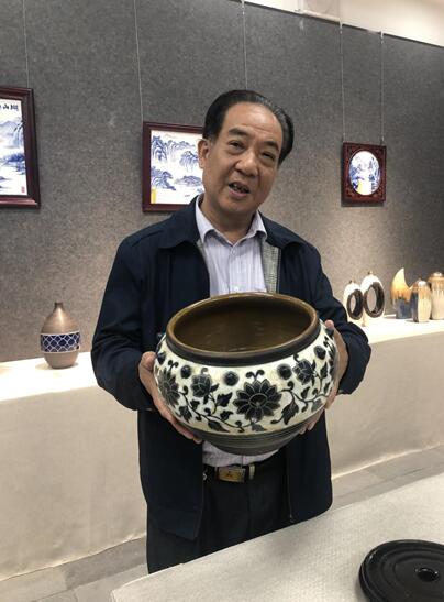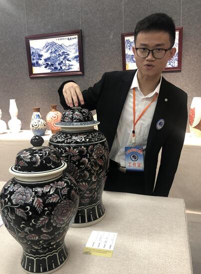 發(fā)源陶瓷有限公司總經理鄧詩優(yōu)告訴記者,“我手持的作品是仿古的藍彩,是去北京和廣西時,在博物館獲取的靈感。發(fā)源陶瓷此次參展帶來了二十件展品,共十四組,有仿古、藍彩的,也有釉面的,造型有聚寶缸和壺等。”