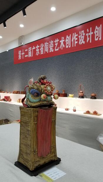 廣東省陶瓷藝術大師、佛山市工藝美術學會副會長兼秘書長周永鏘此次從佛山帶來了十多位作者的30件陶塑作品,作者涵蓋多名中國陶藝大師和省級大師,包含有人物、動物等多個類別,每件都是作者今年創(chuàng)新作品,也代表了當地陶塑工藝人文精神和現今石灣陶藝發(fā)展的方向。其中這樽獅頭陶器是周永鏘的作品,作品頂部以南方扎作獅頭作為題材,下方以傳統(tǒng)傢俬百子柜作襯托,獅頭目光炯炯有神,長須下飄,靜中有動,不怒而威。(鄒錫蘭 梁嘉慧)