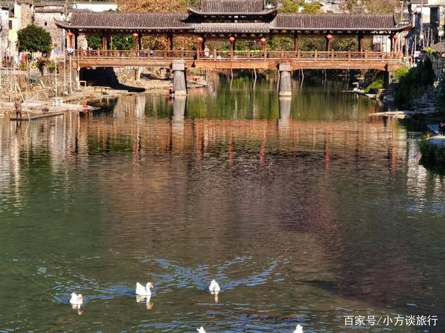 這座小鎮(zhèn)真可謂依山傍水,就坐落于山水之間。清一色的建筑風(fēng)格看上去十分清爽,讓人眼前一亮。一棟棟閣樓在河的兩岸建起,將兩岸聯(lián)通的是一座又一座的古橋,堅(jiān)定地屹立在水的中央。河水清澈見底,有鎮(zhèn)上的居民來此搗衣,也有鴨群在此嬉戲,偶有一老伯撐著一只小舟在湖中前行,一切是那樣的祥和與安逸。