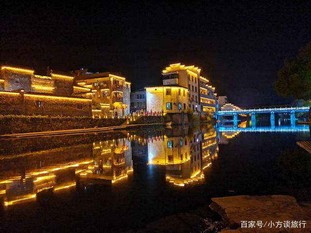 小方最喜歡的是晚上的瑤里,白天看上去平凡的水上房屋在晚上綻放出格外耀眼的光芒。每到夜間,暮色變暗,這里的房屋變化亮起它的金黃色的外燈,倒映在清澈見底的湖水中,湖面上的橋發(fā)出的是藍(lán)色的霓虹燈,金黃色,藍(lán)色,在黑夜真綻放出格外動(dòng)人的曙光,給這座神秘的小鎮(zhèn)披上了華麗的外衣。行走在其間,光芒照耀在自己的身上,仿佛被賦予了美好的祝福,周圍環(huán)境是寂靜的,偶爾傳來潺潺的流水聲以及人們的嬉笑聲。
