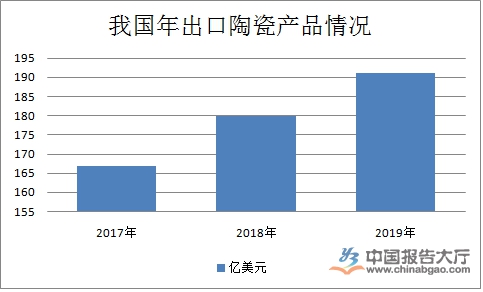 2019年,我國規(guī)模以上建筑陶瓷企業(yè)1435家,產值3831億元,同比增長17.43%;2019年,我國日用陶瓷產量310億件,產值達960億元。年均復合增長率為18.76%;2019年我國藝術陶瓷的工業(yè)產值約在180億元左右。日用陶瓷、建筑陶瓷、衛(wèi)生陶瓷以及藝術陶瓷產品的出口,也呈現(xiàn)全面飄紅的景象。預計2020年我國陶瓷制品產值達到11000億元。