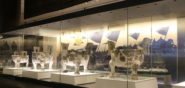 商代的陶器前后差別較大,早期的陶器,以泥質(zhì)灰陶為主,而中晚期的陶器,以泥質(zhì)灰陶和夾砂灰陶為最多,另有少量的泥質(zhì)紅陶。古齊廳中展示了商代的飲酒器陶觚,以及樸素的煮飯器具陶鬲,見微知著,透過展品,商朝的社會(huì)風(fēng)貌可見一斑。