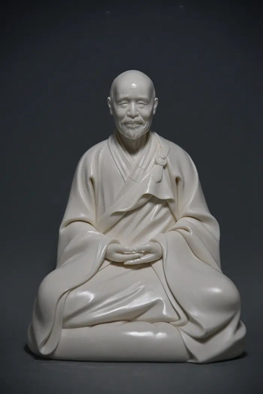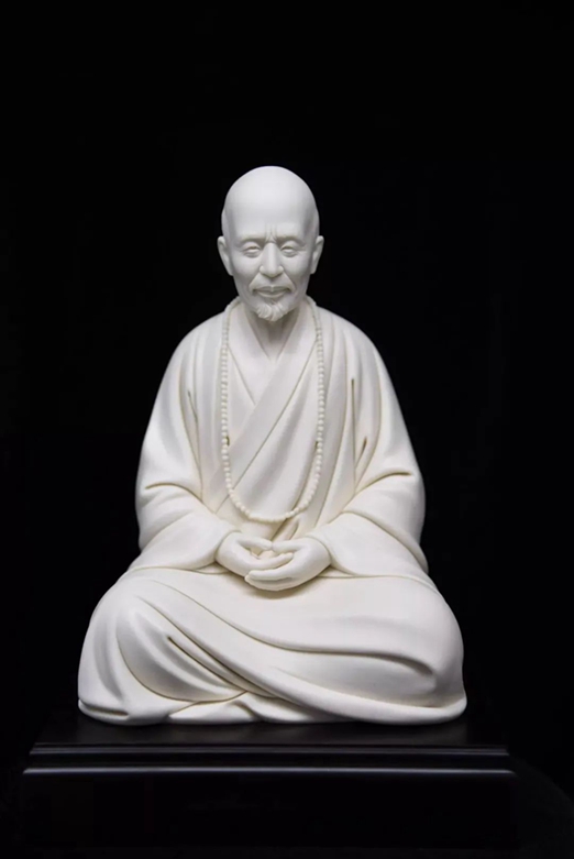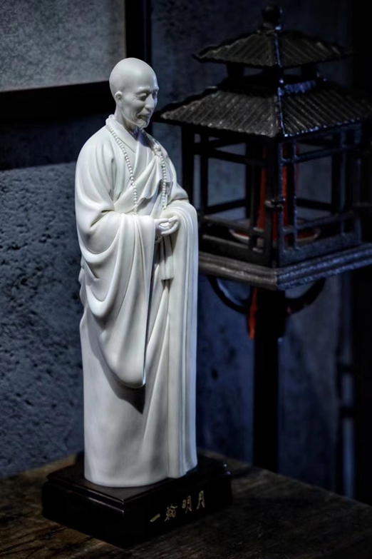 此后,他們用了將近一年的時(shí)間進(jìn)行構(gòu)思、打稿,經(jīng)過數(shù)十次的修改,終于成功創(chuàng)作出弘一法師塑像,其笑容微露,目視前方,雙手手心向上輕輕交疊,仿佛捧著交集的悲欣;法衣寬腰闊袖,重磅下垂,端莊嚴(yán)整又自在無礙。作品呈現(xiàn)的弘一法師心如明月、法喜充盈,已然具足萬德,華枝春滿,天晴月圓。他們將作品命名為《一輪明月》。