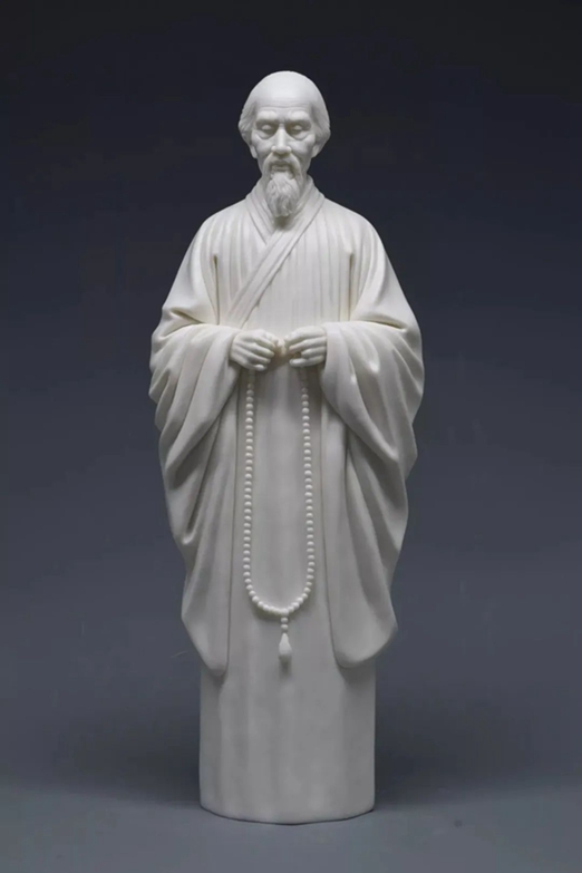 在此,弘一法師題材的陶瓷藝術(shù)品排滿壁柜,或坐或站,每一尊雕像都透出弘一法師獨(dú)特的慈悲神情。