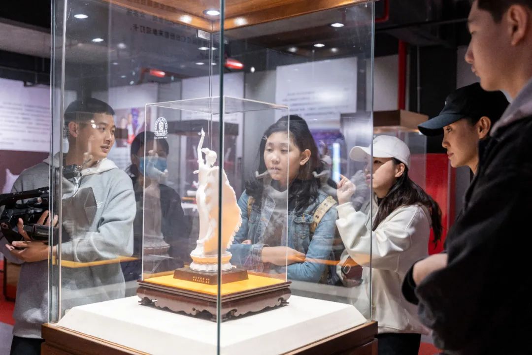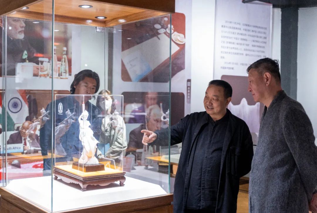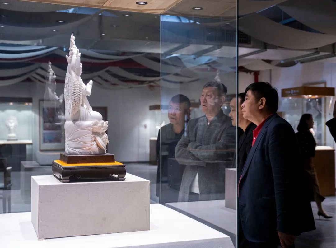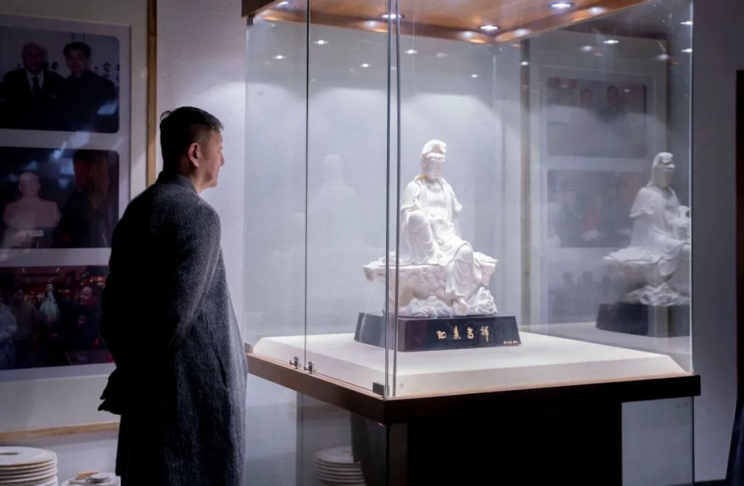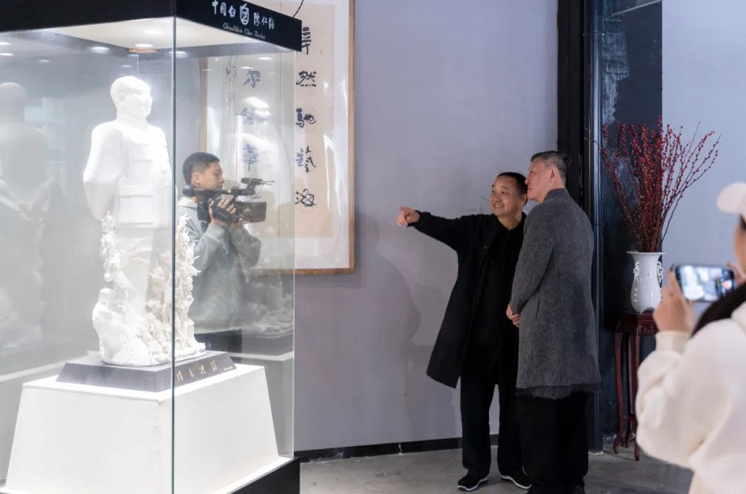 隨后,韓磊老師一行饒有興致的鑒賞了中國白陳仁海團(tuán)隊創(chuàng)作的《紫歸牡懷》《閩龍出海》《誰主沉浮》《夢回大唐》《點亮世界》《開拓輝煌》等一系列見證國家發(fā)展歷程,貼近時代、貼近生活、貼近群眾,富有時代特征的瓷雕藝術(shù)作品,近距離感受中國白陳仁海團(tuán)隊堅持“中國白”文化自信,三十年只做一件事——復(fù)興中國白,引領(lǐng)“中國白”文化走向世界的創(chuàng)作初心以及中國白陳仁海團(tuán)隊與國家同命運共呼吸、融史于瓷、精雕細(xì)琢、精益求精的創(chuàng)作匠心。