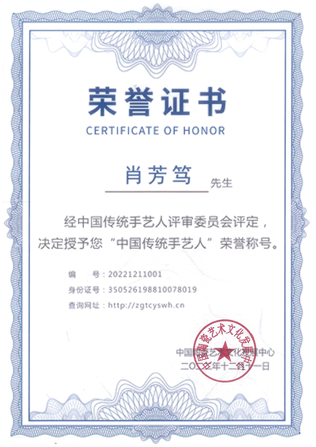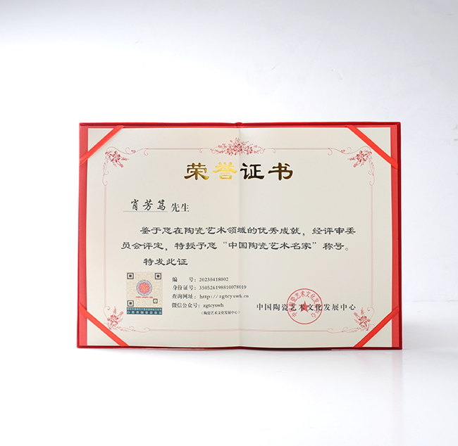 肖芳篤出生于“世界瓷都德化”,從小耳濡目染,便喜歡上陶瓷這門藝術,2013年開始學習陶瓷制作,肖芳篤深入大師工作室,從點點滴滴學起。經(jīng)過近10年的拜師學藝,熟練掌握制瓷各個工序,如瓷泥加工、手拉胚、塑樣、燒制等無不樣樣精通。先后深入宜興等地學習交流制壺技藝。2021年成立德化瀚篤陶瓷有限公司,經(jīng)過多年積累,創(chuàng)作出一系優(yōu)秀茶器作品,主要作品有冰種玉瓷茶具套裝、主人杯、瓷壺、手繪茶器等,所創(chuàng)作品造型優(yōu)美、瓷質溫潤如玉,作品曾多次獲各評比金獎,2022年《招財納!窐s獲北京陶瓷藝術名家作品展金獎,2023年《人生雅事》、《精雕禪定杯》榮獲北京陶瓷藝術名家作品展金獎,作品廣受客商、收藏愛好者喜愛。