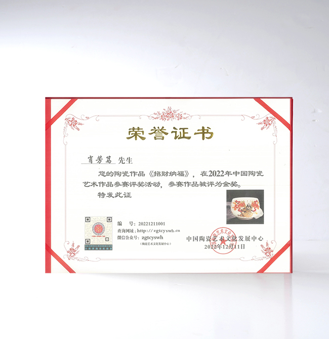 2022年《招財納!窐s獲北京陶瓷藝術名家作品展金獎