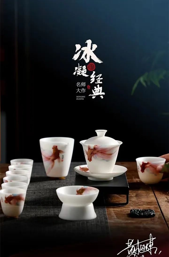 冰凝玉瓷質細膩通透,手感溫潤,一條繪制精美、身形俊逸的金魚游弋其上,充滿著動感和生命的活力。金黃色的鱗片,層層分明,栩栩如生;長長的魚尾紋理清晰,似一片綻放在水里的粉色花瓣,又仿佛一襲色彩柔和的長裙,優(yōu)雅不失清新,靈動飄逸得仿佛是另一個平行時空的“孔雀開屏”。