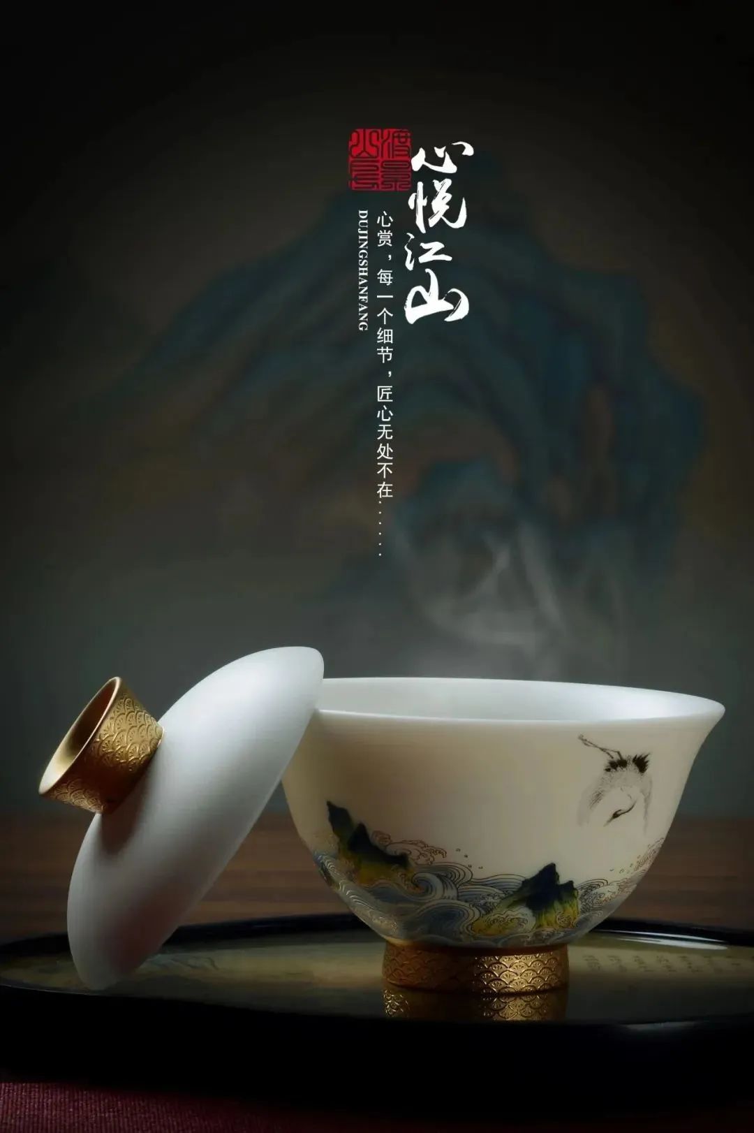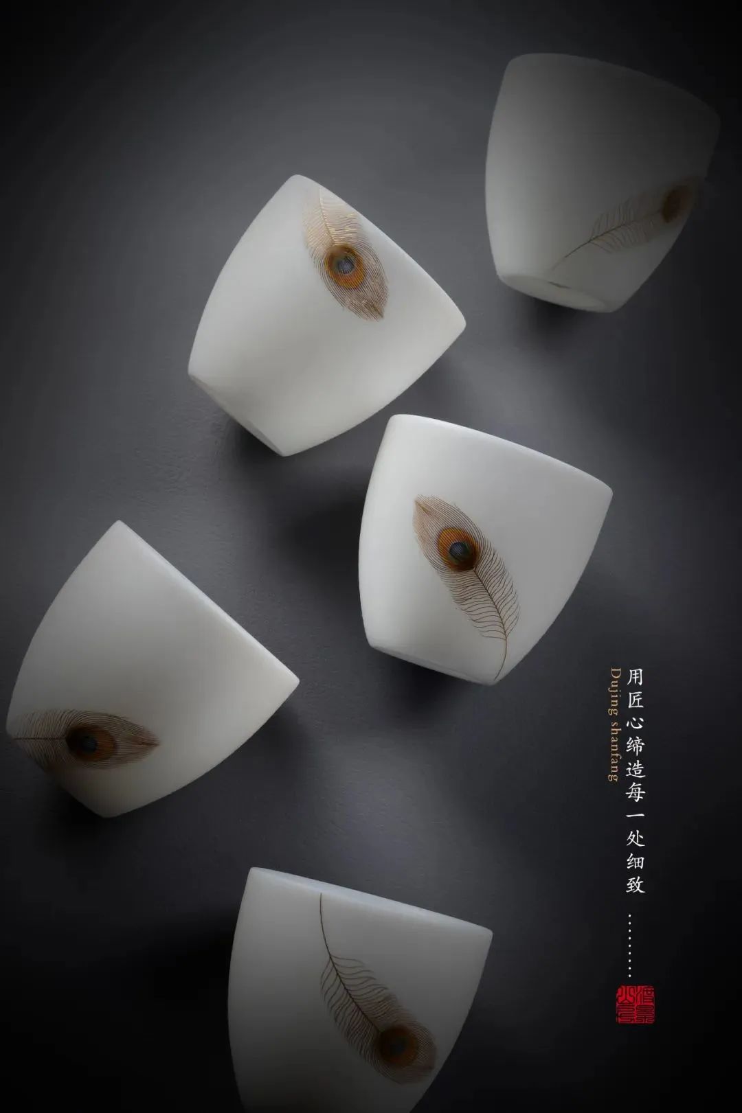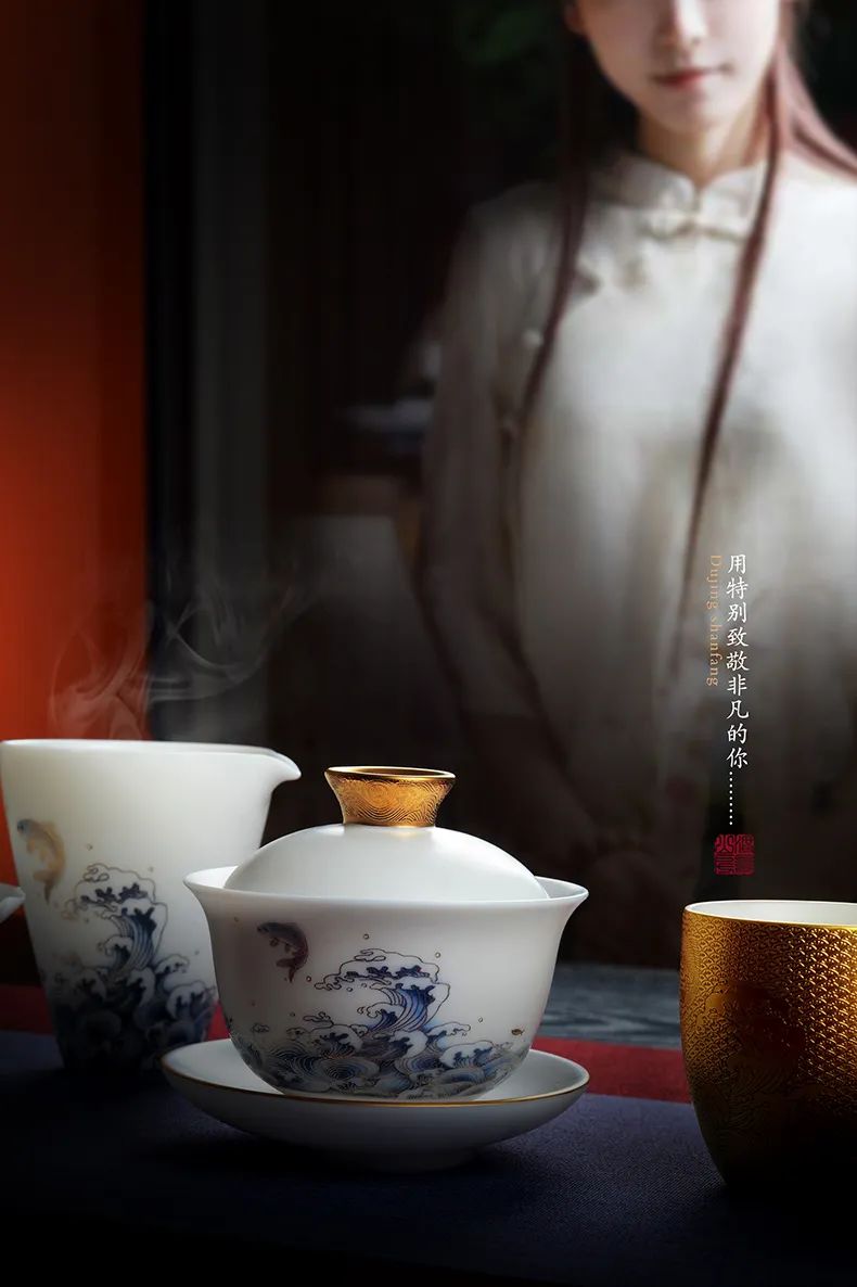 黃旭東用心思考茶與器的和諧之道。他充分利用自己花紙廠的資源,花費了大量時間潛心研究特殊的陶瓷花紙工藝,同時思考什么樣的材質裝飾可以為本已經完美的羊脂玉加分。如果設計材料毫無亮點則畫蛇添足、弄巧成拙。
