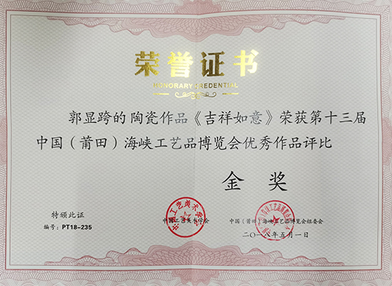 2018年05月《吉祥如意》榮獲第十三屆中國(莆田)海峽工藝品博覽 會優(yōu)秀作品評比金獎;