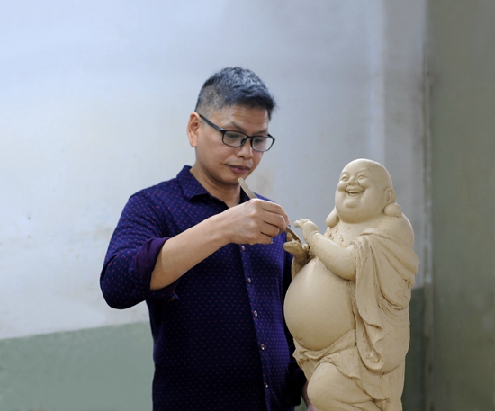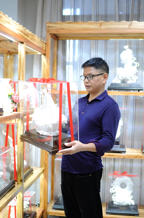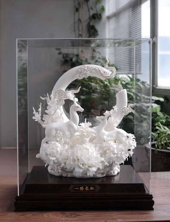 郭顯跨從小深受陶瓷文化熏陶,完成學業(yè)后開始專注陶瓷雕塑創(chuàng)作,經(jīng)過20多年的學習與積累,其精通制瓷各工序,熟練掌握雕塑、捏花、制釉、燒制等技藝。所創(chuàng)作品精選優(yōu)質(zhì)瓷泥,用心配制,以1300多度高溫燒制而成,瓷胎細膩堅致,色溫潤如玉,剔透光滑,猶如雪白霜凝,釉面光滑,擊聲如磐。