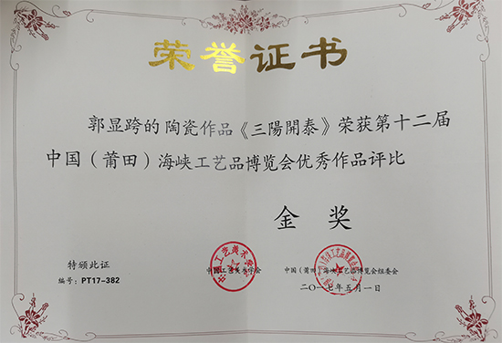 2017年07月《三陽開泰》榮獲第十二屆中國(莆田)海峽工藝品博覽 會優(yōu)秀作品評比金獎;