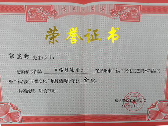 2022年07月《招財進寶》榮獲泉州市“福”文化工藝美術精品展暨“ 福建輕工福文化”展金獎;