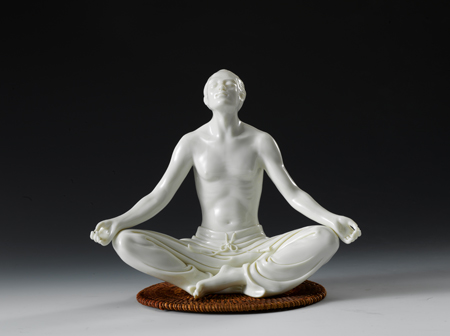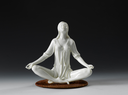 這就是不滿足于停留在傳承層面上,而是不斷開闊自己的眼界與識(shí)度,自覺地在文化修養(yǎng)、社會(huì)活動(dòng)與人生閱歷等方面充實(shí)自己,形成自己更加開放的心境與更加豁達(dá)的胸懷,形成從工到藝、以藝帶工的思想升華,從而走出一條具有鮮明時(shí)代特征與個(gè)性情懷的瓷塑創(chuàng)造之途!抖U心》系列作品便是在傳統(tǒng)之余的創(chuàng)新之作。人物盤膝而坐,雙手?jǐn)傞_輕輕放在膝蓋上,頭微仰面向天空,眼睛微閉,靜心之意撲面而來。此作品借鑒了瑜伽的姿勢(shì)造型,卻在精雕細(xì)刻與抽象寫意之間相生相融,相輔相成。