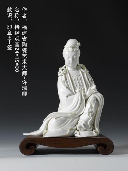 到了許瑞卿,許氏家族已經(jīng)傳承了六代。出生于1975年的許瑞卿,從小就在家族瓷塑氛圍中浸染,對(duì)瓷塑藝術(shù)有著非常濃厚的興趣,再加上得到其父許興泰的傾心培養(yǎng),從藝二十余載,其多件瓷塑作品在國(guó)家級(jí)展評(píng)會(huì)上獲獎(jiǎng),被省級(jí)以上文博單位永久收藏。目前,許瑞卿已是高級(jí)工藝美術(shù)師、福建省工藝美術(shù)名人、福建省陶瓷藝術(shù)大師、中國(guó)收藏家最喜愛的藝術(shù)大師。