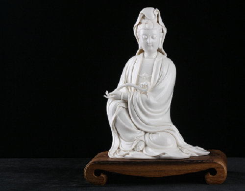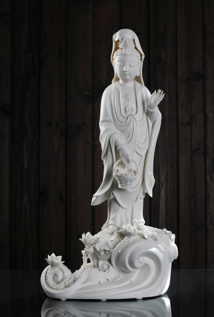 此尊觀音像高47厘米,底長(zhǎng)24厘米,寬16厘米,頭髻發(fā)束,面容慈祥,寬袖衣裙、手提竹籃、腳踏鰲背,釉面光潤(rùn)明亮,胎質(zhì)致密透光,雕塑精細(xì),采用堆花、貼花、鏤空、刻畫等多種工藝,使觀音衣褶裙帶線條流暢、洗練,形象栩栩如生。