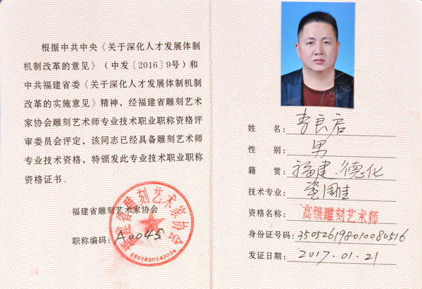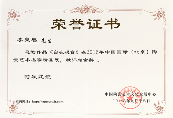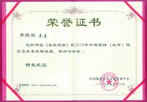 作品《坐巖觀音》榮獲中國(北流)國際陶瓷博覽會CBICE中國陶瓷產品(作品)創(chuàng)作設計大賽銅獎和榮獲第十一屆中國(莆田)海峽工藝品博覽會優(yōu)秀作品評比金獎,