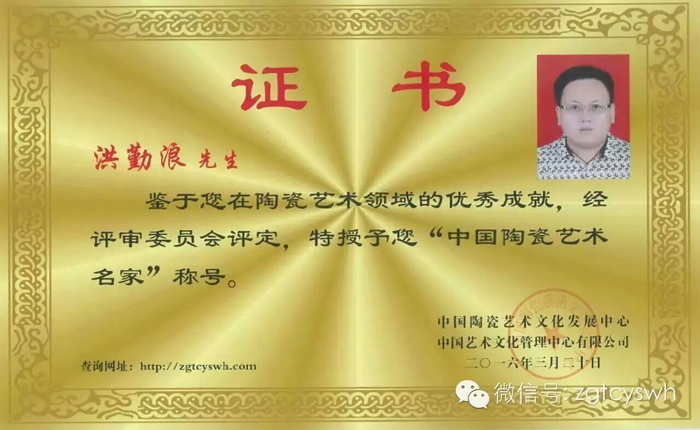 洪勤浪,藝名:布依仁,畢業(yè)于景德鎮(zhèn)陶瓷學院,江西省工藝美術家,江西省高級技師(國家一級),國家陶瓷雕刻一級工藝美術師,江西省工藝美術師,2016年獲“中國陶瓷藝術名家”稱號,景德鎮(zhèn)市昌江區(qū)政協(xié)委員,景德鎮(zhèn)非物質文化遺產(代表性)雕刻傳承人,輝煌中國書畫陶瓷藝術研究院研究員,中國陶瓷藝術文化發(fā)展中心景德鎮(zhèn)分中心主任,景德鎮(zhèn)市技?妥淌,景德鎮(zhèn)市陶瓷歷史文化研究會理事,景德鎮(zhèn)民間藝術家協(xié)會會員,景德鎮(zhèn)陶瓷藝術交流中心會員。