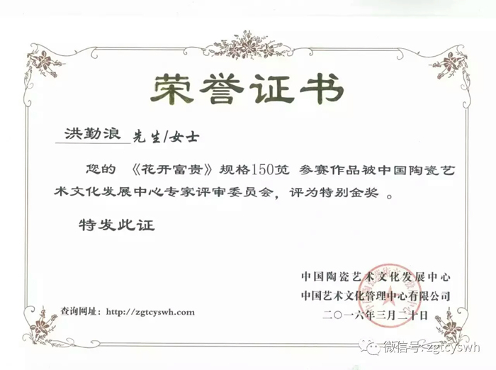 2009年為前國家主席胡錦濤同志制作《松鶴延年》福桶瓶,作為國家禮品瓷。為建國六十周年而制作的《和諧盛世》福桶瓶被多位中央領導人和眾多國內外陶瓷愛好者珍藏,