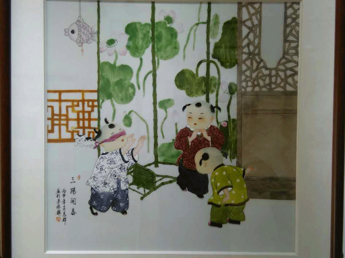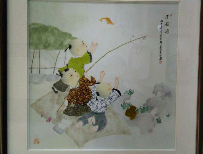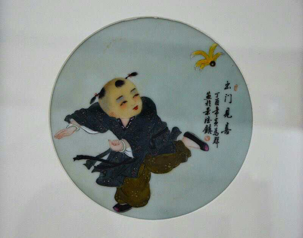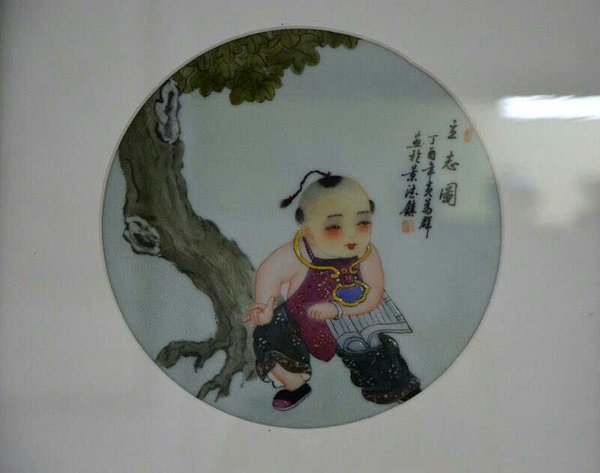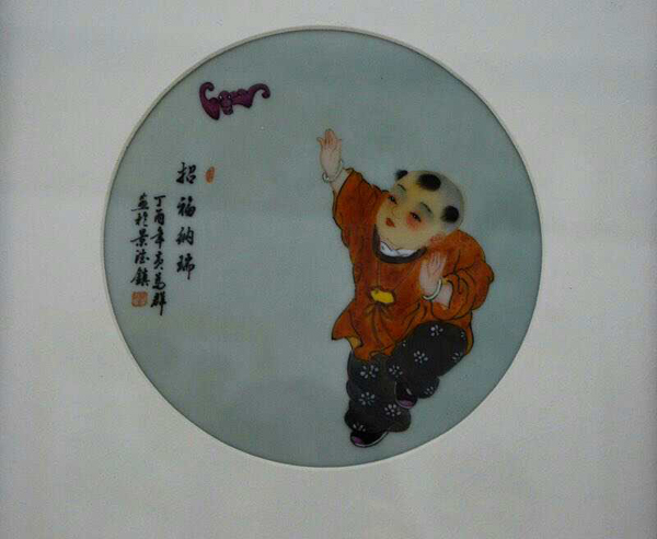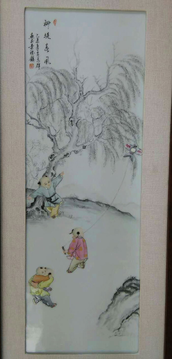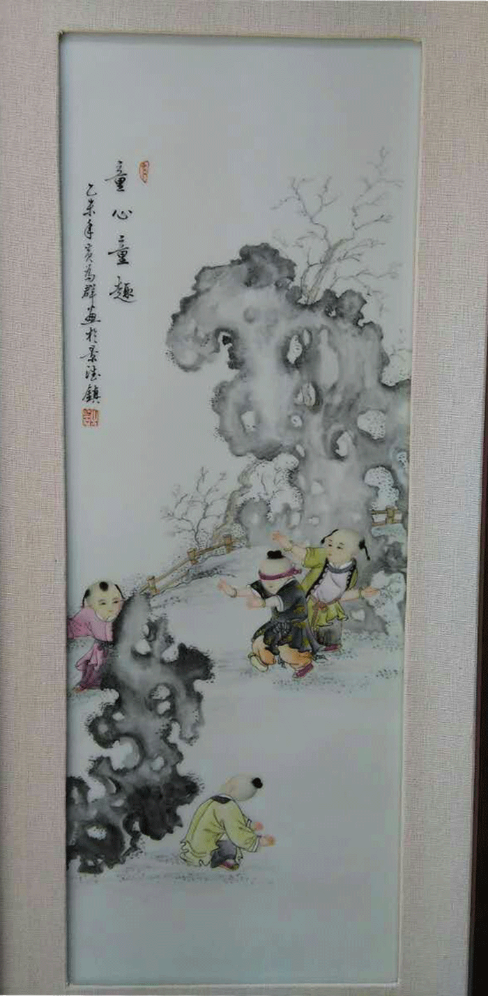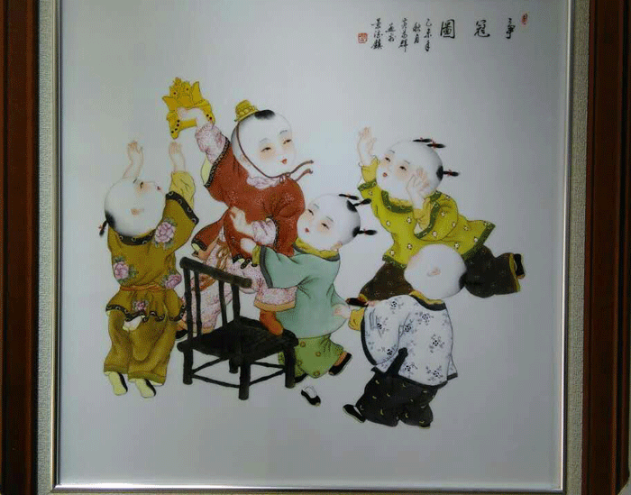 瓷板作品2013年江西省工藝美術(shù)“國瓷杯”陶瓷精品大賽榮獲“金獎(jiǎng)”新彩“童子爭冠圖”鞍山市博物館永久收藏。