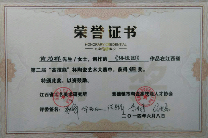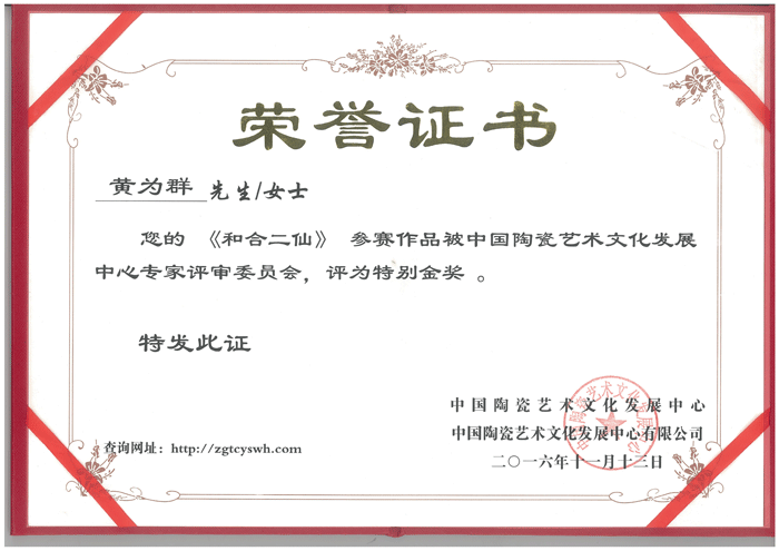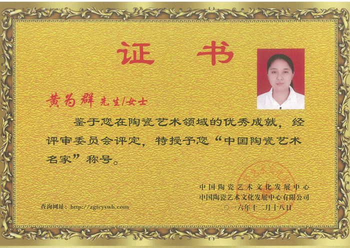 2016年經(jīng)中國陶瓷藝術(shù)文化發(fā)展中心評(píng)審委員會(huì)評(píng)定為“中國陶瓷藝術(shù)名家”。