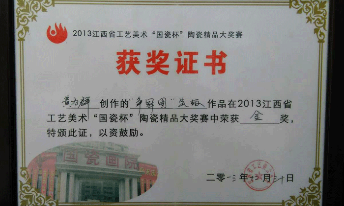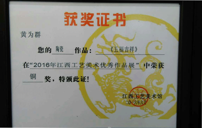 創(chuàng)作的《五福吉祥》在2016年江西工藝美術(shù)優(yōu)秀作品展中榮獲“銅獎(jiǎng)”。并被江西工藝美術(shù)館收藏。 作品《釉上粉彩童子》經(jīng)中國陶瓷藝術(shù)文化發(fā)展中心評(píng)審委員會(huì)評(píng)定為“特別金獎(jiǎng)”。