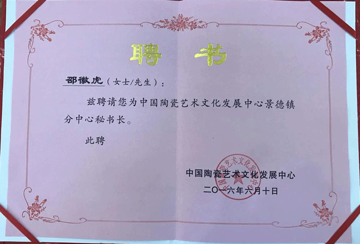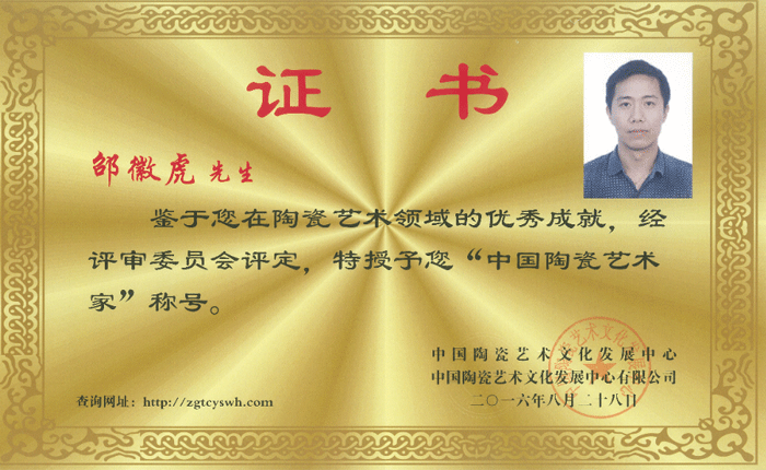 邵徽虎,筆名“羽墨”,1978年出生于景德鎮(zhèn),畢業(yè)于陶瓷大學(xué),入行后受各名家指點(diǎn),現(xiàn)為中國(guó)陶瓷藝術(shù)文化發(fā)展中心景德鎮(zhèn)中心秘書長(zhǎng),景德鎮(zhèn)陶瓷設(shè)計(jì)研究院主創(chuàng)設(shè)計(jì)師,中國(guó)陶瓷藝術(shù)家,江西省高級(jí)陶瓷美術(shù)師、工藝美術(shù)師、技師,品墨軒陶瓷藝術(shù)創(chuàng)始人,中國(guó)中青年陶瓷藝術(shù)家,江西省工藝美術(shù)協(xié)會(huì)會(huì)員,陶瓷商會(huì)會(huì)員,民間美術(shù)家協(xié)會(huì)會(huì)員。
